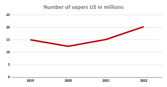 - The global e-cigarette and vape market was valued at US$22.8bn in 2022 compared with $3bn in 2016 and expected to grow to US$28bn by 20263